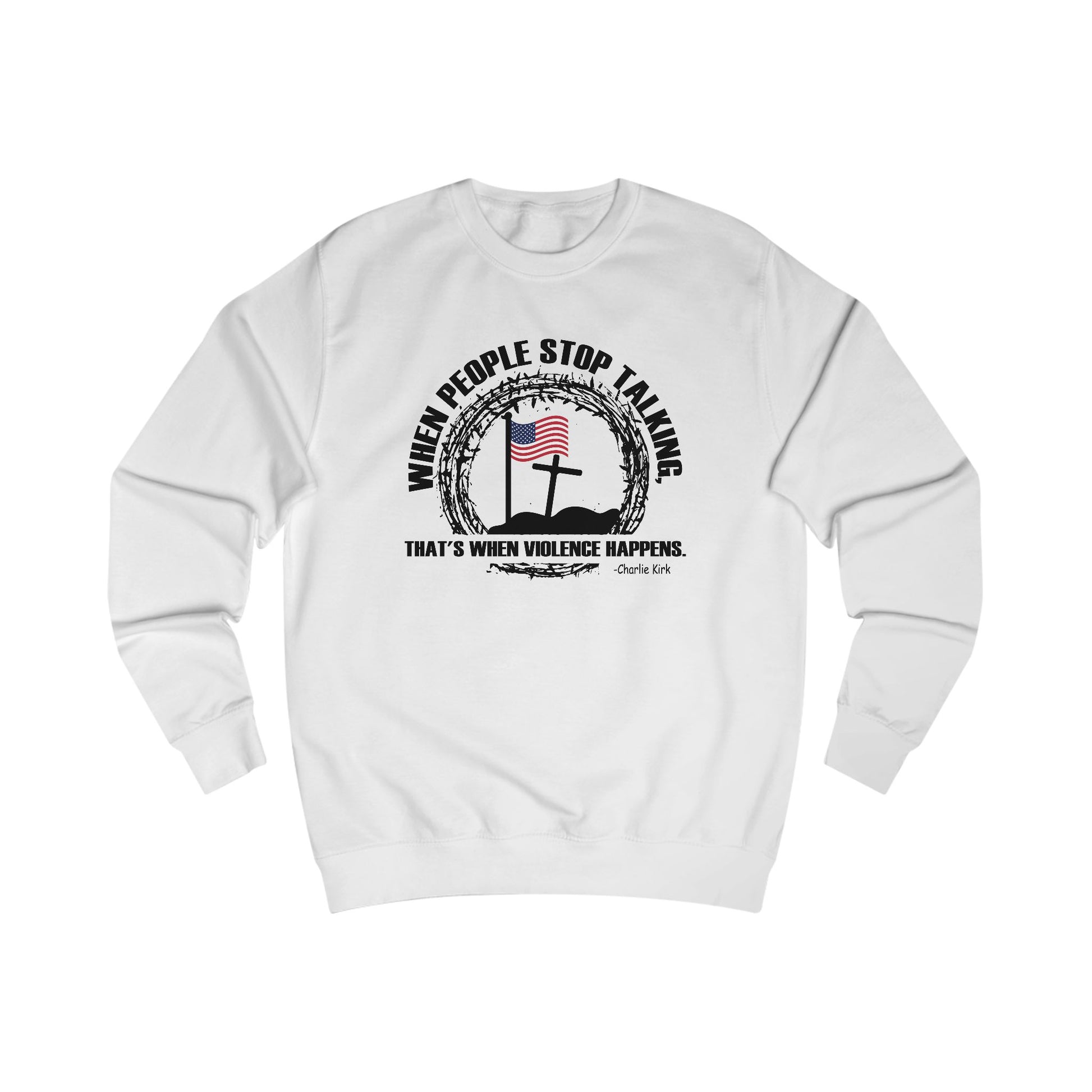 Stay warm while making a bold statement in this unisex sweatshirt featuring a powerful design with the American flag, cross, and the inspiring quote, “When people stop talking, that’s when violence happens.” Crafted from a durable cotton-polyester blend, it offers medium-heavy fabric weight for warmth without compromising comfort or breathability.